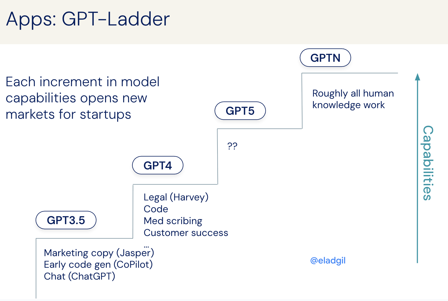 This leads to the concept of the GPT Ladder - at a certain level of GPT (or Claude, or Gemini, or Grok, or Llama) release, specific new markets will open up. For example, GPT-5 (or Claude X, or Gemini Y) should support an entirely new market that simply was not tractable technologically in the absence of the model.
