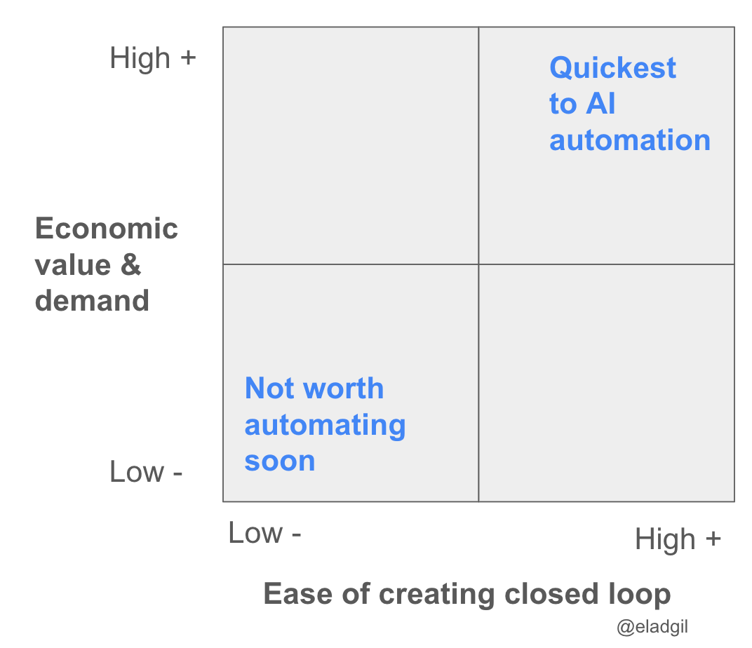 AI will first automate away the things that are easier to form a closed loop learning system on. This is why code and AI research may be accelerated and then displaced quickly - you can have testable closed loop systems so machines can learn and iterate quickly. The tighter the closed loop, the faster the AI can learn. You can make a 2x2 of jobs by how closed loop they can be made, versus their economic value, and see where AI may impact labor fastest. Fast time to closed loop + high economic value = fastest AI impact (hence software engineering).