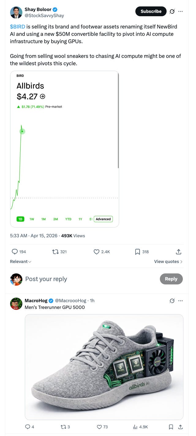 Things have gotten to the point where Allbirds (shoe company) just raised a convert to build a GPU farm. Will they be to AI what Microstrategy is to crypto?