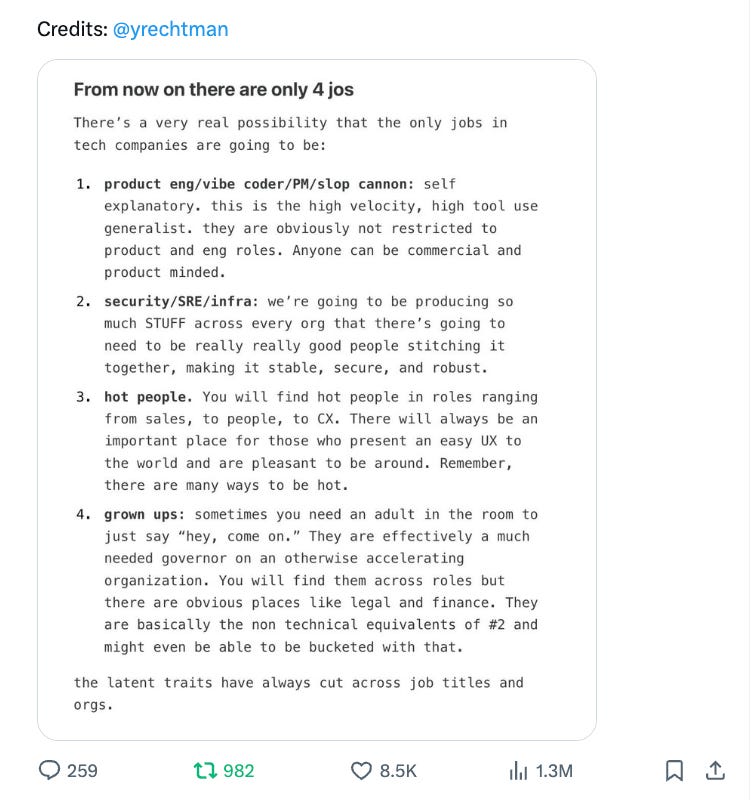 Deep artisanal “my code is my craft” and “I love creating bespoke things” engineers decreasingly happy in world of AI. Systems thinkers and product thinkers engineers happiest. Many people are a mix of both.