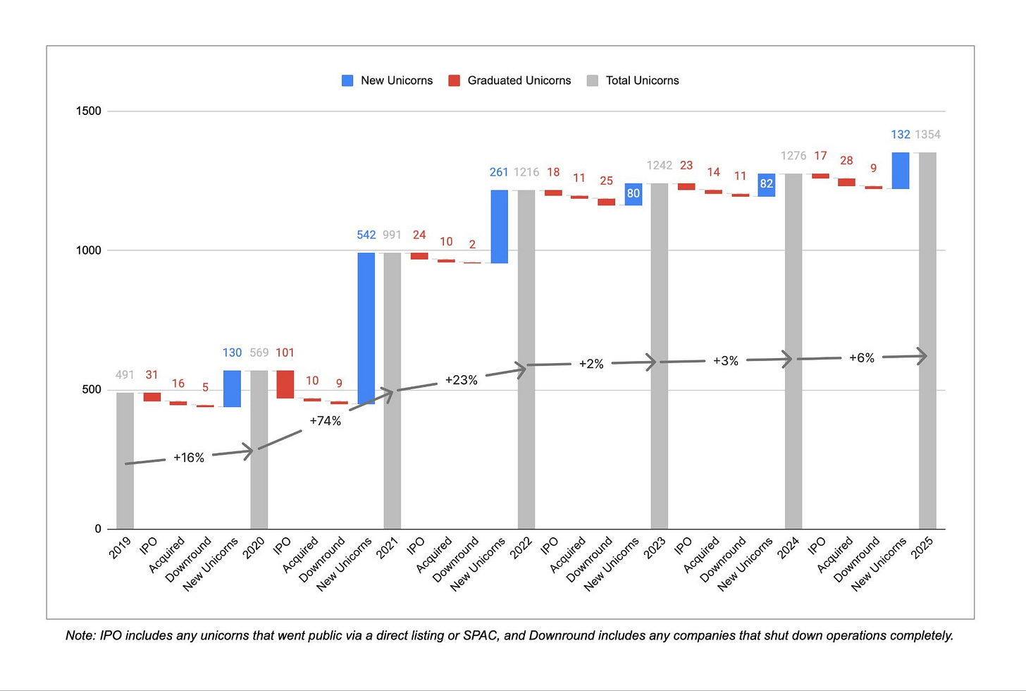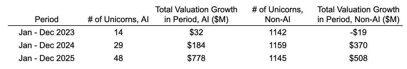 New unicorn creation has slowed down: Just ~300 new unicorns were minted between 2022 and 2025, compared to more than 900 in the three years prior.