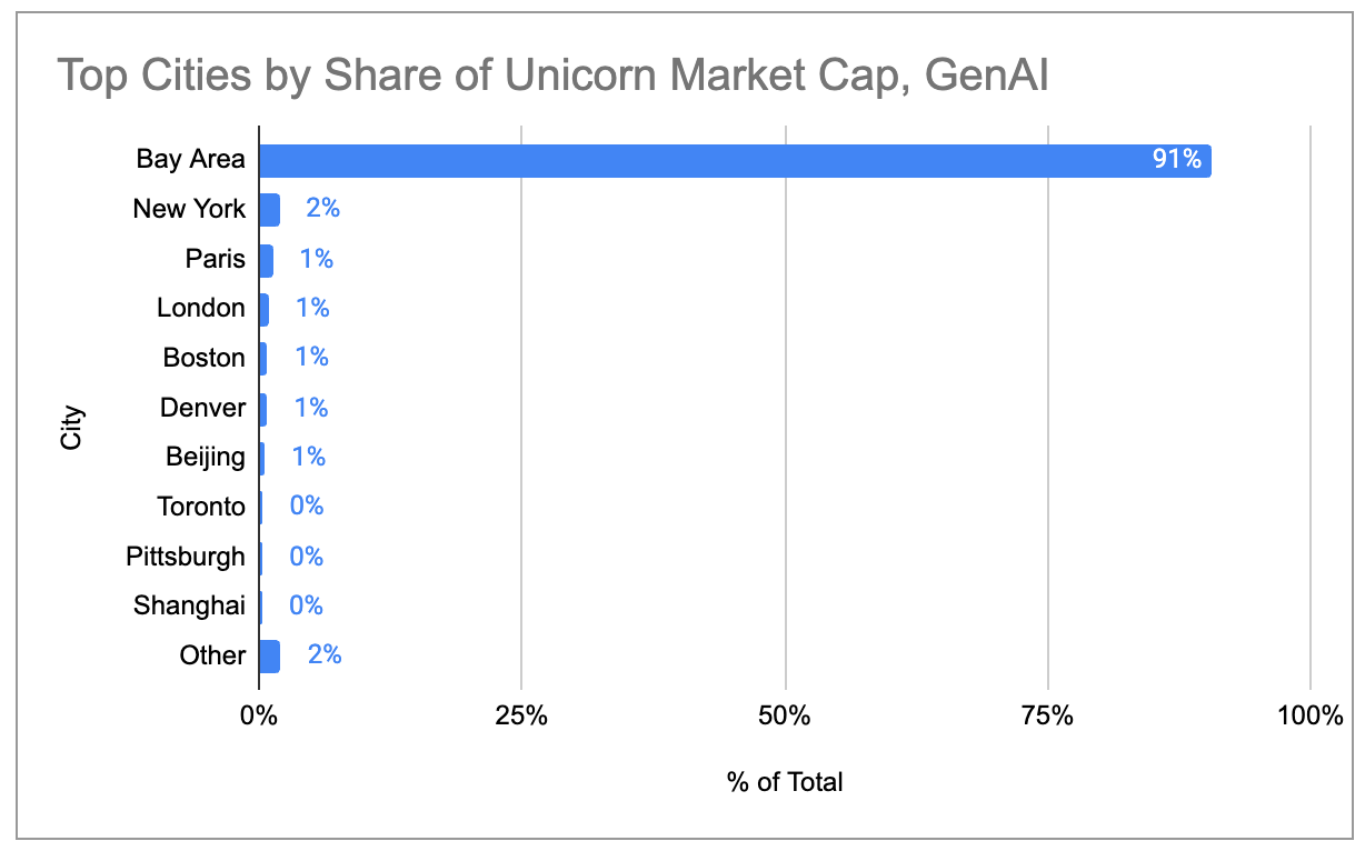 If we restrict our attention to the 97 unicorns that primarily sell products/services related to generative AI, the Bay Area is even more of a concentrated “super-cluster.” The Bay Area is home to 91% of all gen AI unicorn market cap; no other city is above 2%.