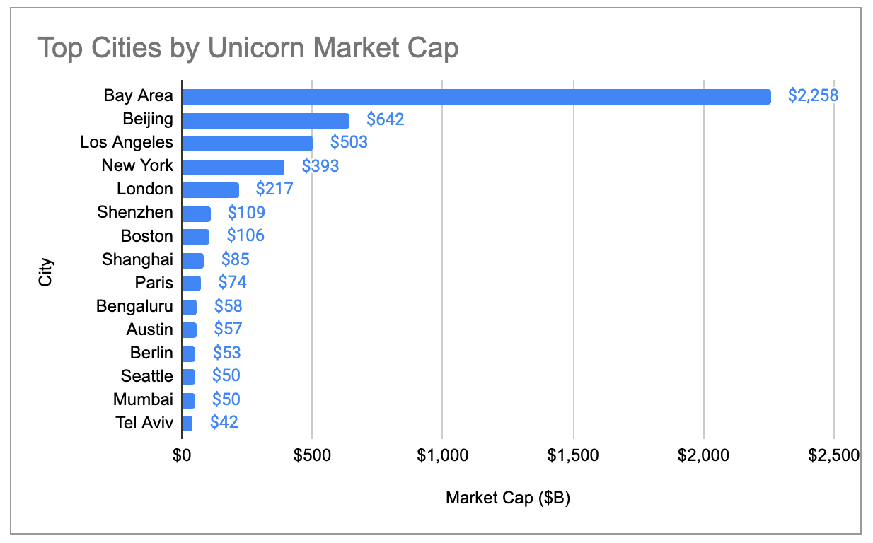 Unicorn market cap is at best a rough, backwards-looking proxy for startup activity within ecosystems, and there are undoubtedly errors in mapping specific companies to corresponding valuations, cities, industries, etc. That said, we believe the data provides a directionally correct view of major year-over-year trends.