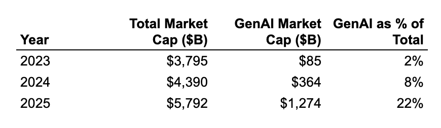Analysis below from Shreyan Jain. All data pulled on Dec 31st of the year, so “2025” means Dec 31 2025 / Jan 1 2026 in terms of market caps.