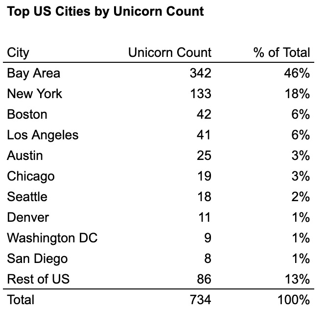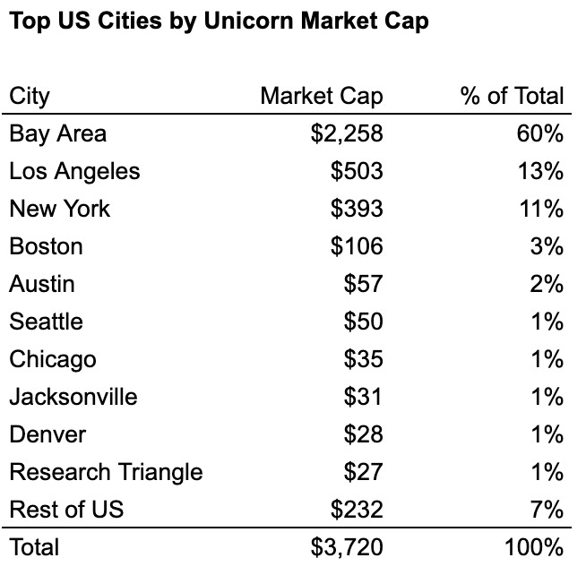 Within the US, four industry-towns combine to make up ~76% of all unicorns and ~87% of all unicorn market cap: the Bay Area, New York, Los Angeles, and Boston. Among these, the Bay Area is clearly the biggest hub, with more than 2x as many unicorns and more than 4x as much market cap as second-place New York/Los Angeles.