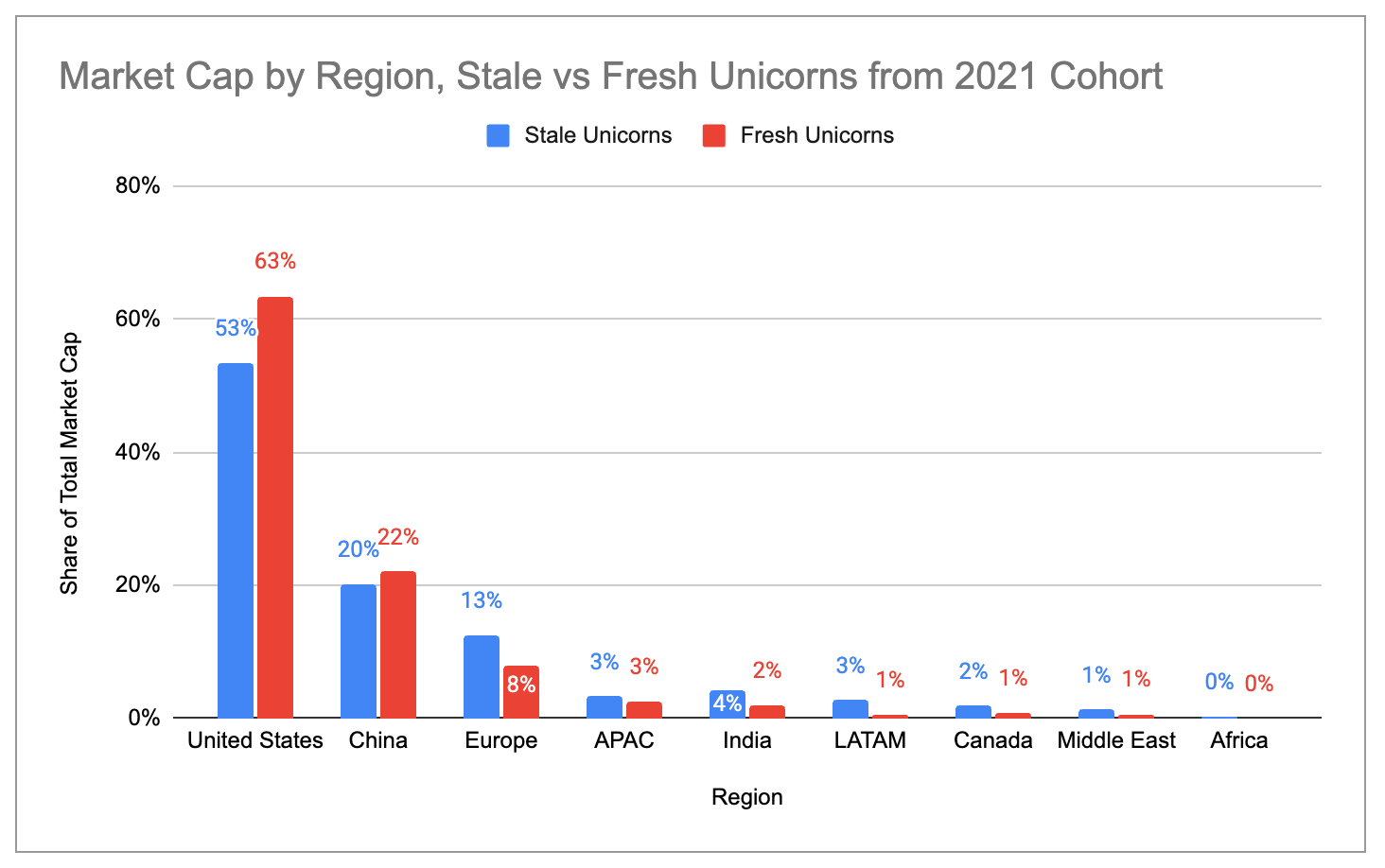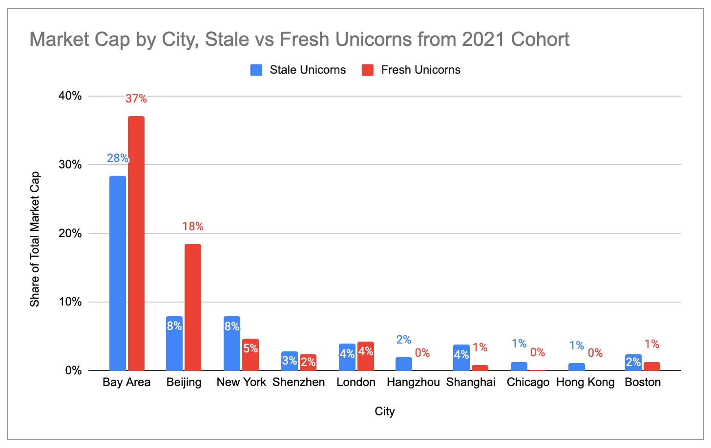 Both the US broadly and the Bay Area specifically have a much higher share of “fresh” unicorns (i.e. unicorns from 2021 that have raised new rounds since) than of stale unicorns. By comparison, Europe, India, LATAM and New York have higher concentrations of stale unicorns than of fresh ones.