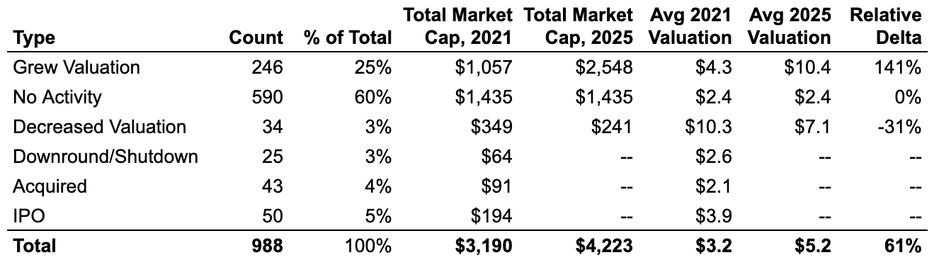 Roughly 60% of the nearly 1,000 companies that were unicorns as of December 2021 have kept their unicorn status without raising any new round. These “stale” unicorns raised enough capital to survive for the past 4 years, but haven’t been able to grow beyond their ZIRP-era valuation. Collectively, the stale unicorns from 2021 account for ~$1.4T of present day unicorn market cap, nearly 25% of the global total.