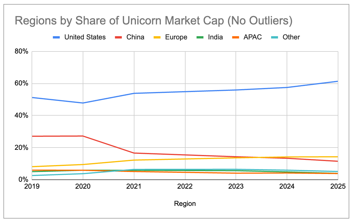 Recent unicorns are even more concentrated in the US / Bay Area. The US has 83% share of total market cap across companies that became unicorns in 2023 or later, compared to 60% across companies that became unicorns in 2022 or earlier. Similarly, the Bay Area’s share is 63% in the 2023-2025 cohort vs 33% in the 2022-or-earlier cohort.