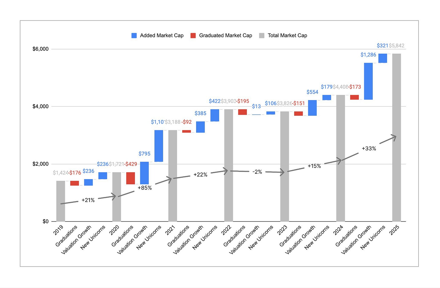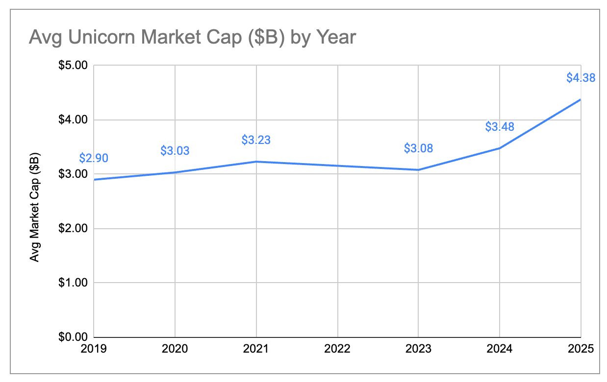 Although the number of unicorns has stayed roughly flat, the aggregate market cap of those unicorns has grown quite significantly. Total market cap across all unicorns increased by 33% in the past year, from ~$4.4T to ~$5.8T. This was a big rebound from the 2 years prior, and in particular relative to 2023 when aggregate market cap actually shrunk YoY. While market cap growth has historically been driven more by new companies becoming unicorns than by existing unicorns growing their valuation, most (~80%) of the market cap creation in 2025 was due to existing unicorns growing their valuation. As a result, the average per-unicorn market cap has increased from ~$3B to ~$4.4B, the highest mark we’ve seen in the 6 years we’ve done this analysis. While it’s harder to become a unicorn, those companies that do pass the $1B mark are on average more valuable and faster-growing than previous years.