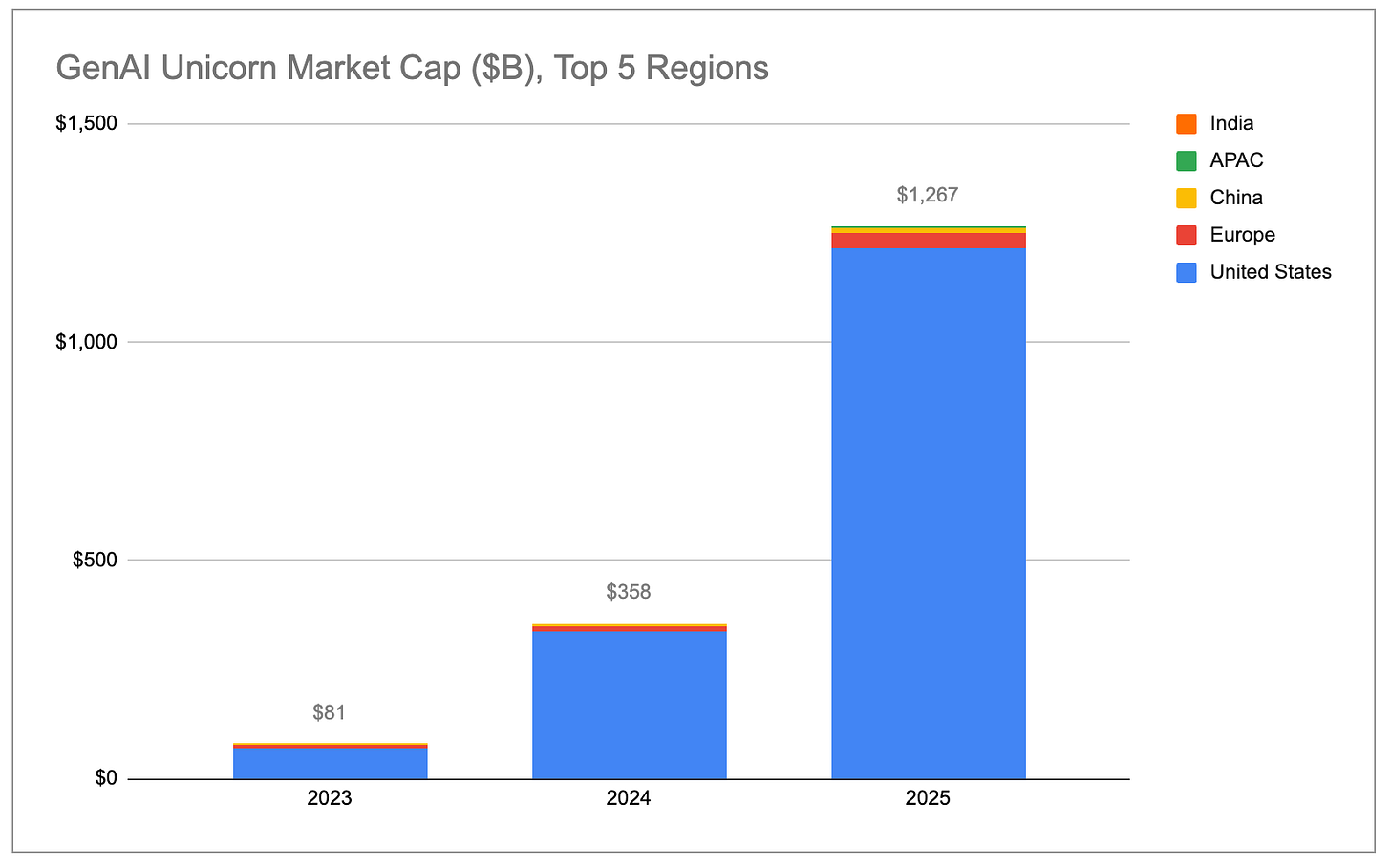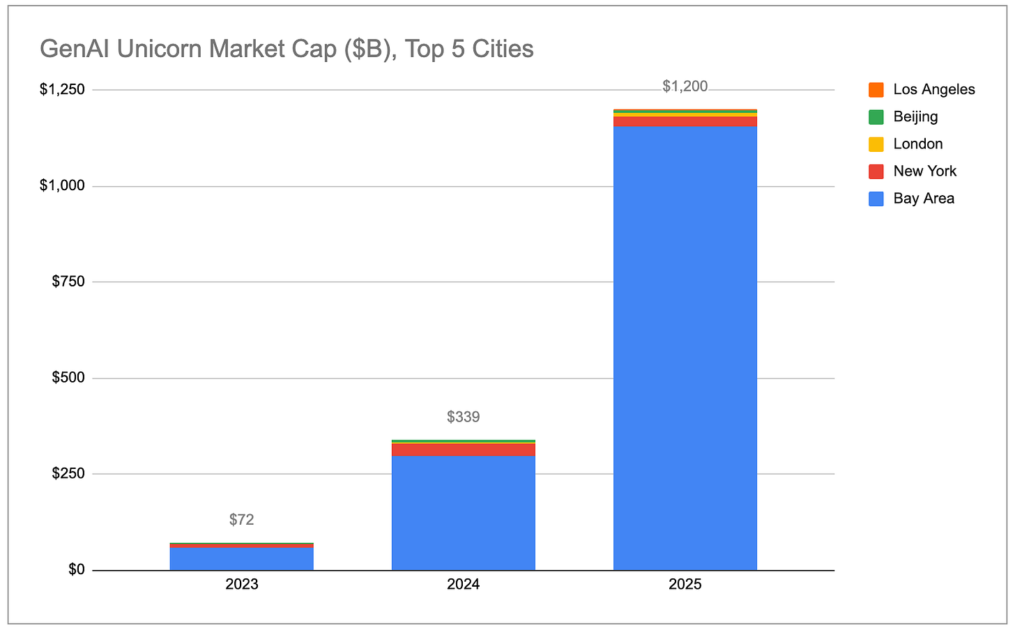 Aggregate gen AI unicorn market cap is growing exponentially, with almost all of the gains coming from the US broadly and the Bay Area specifically.