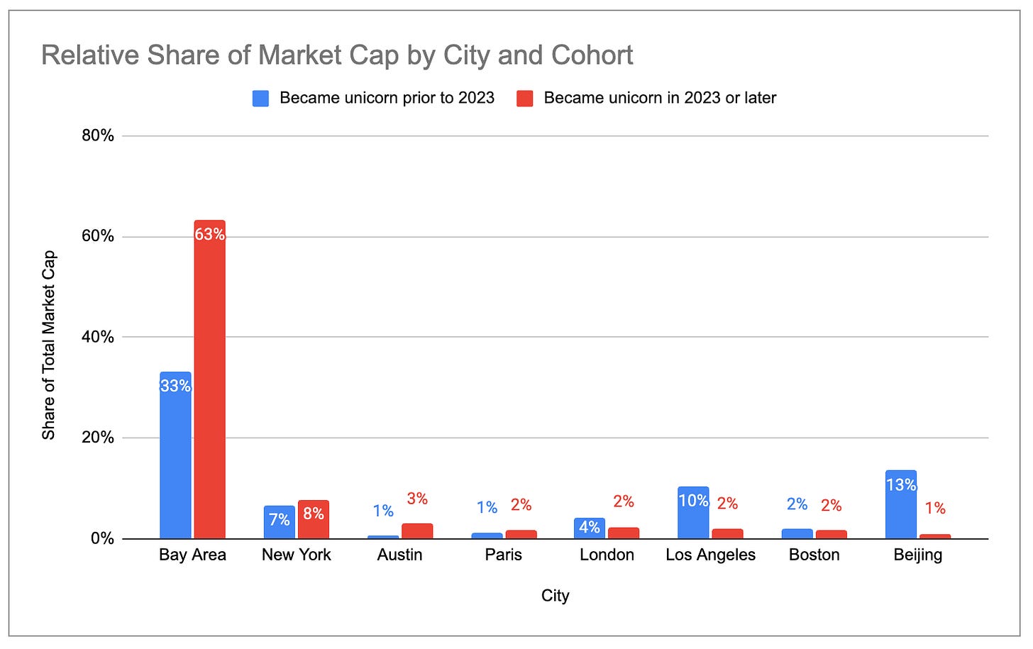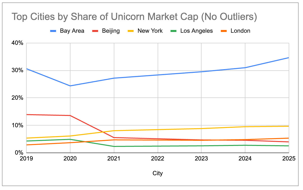 The Bay Area similarly has 4x more unicorn market cap than any other city, growing its share of global market cap from 29% in 2024 to 39% today:
