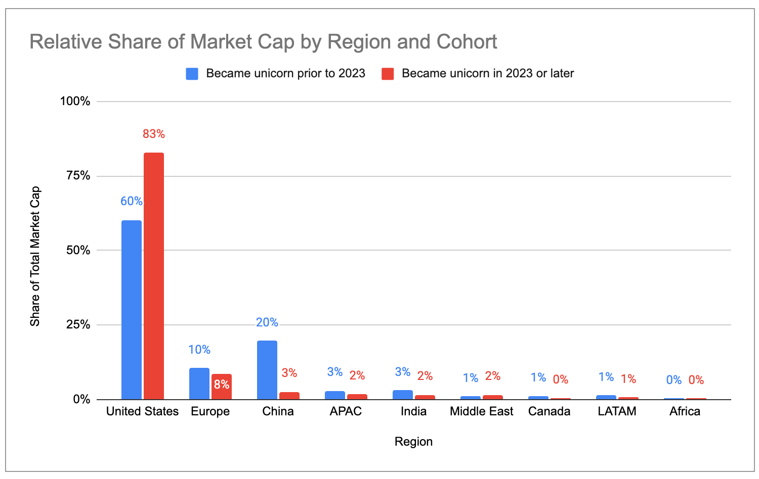 Recent unicorns tend to cluster more in the US and less in Europe and China. The Bay Area has 63% of market cap across all net-new unicorns minted since 2023, compared to 33% of market cap across older unicorns.