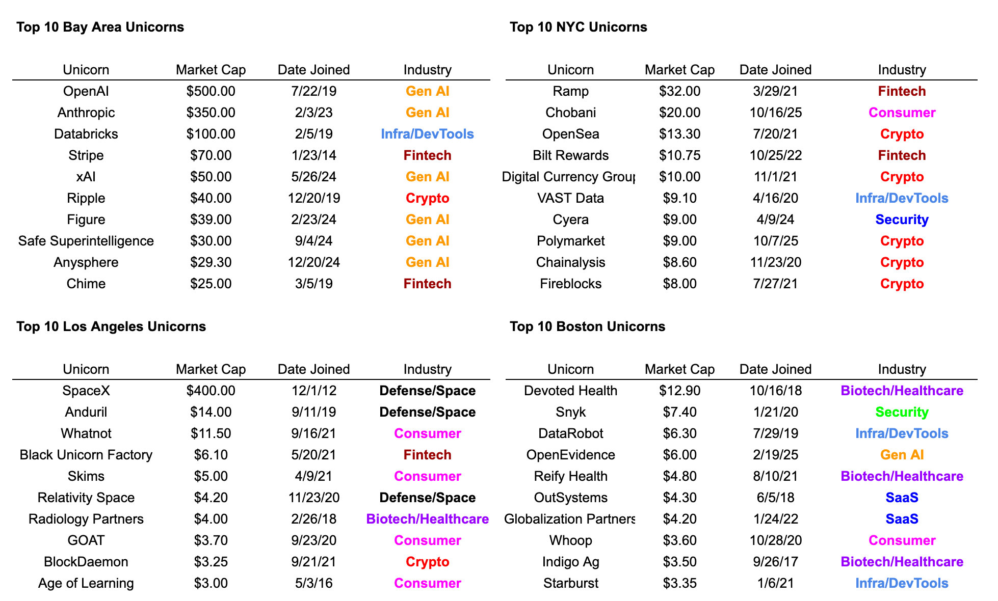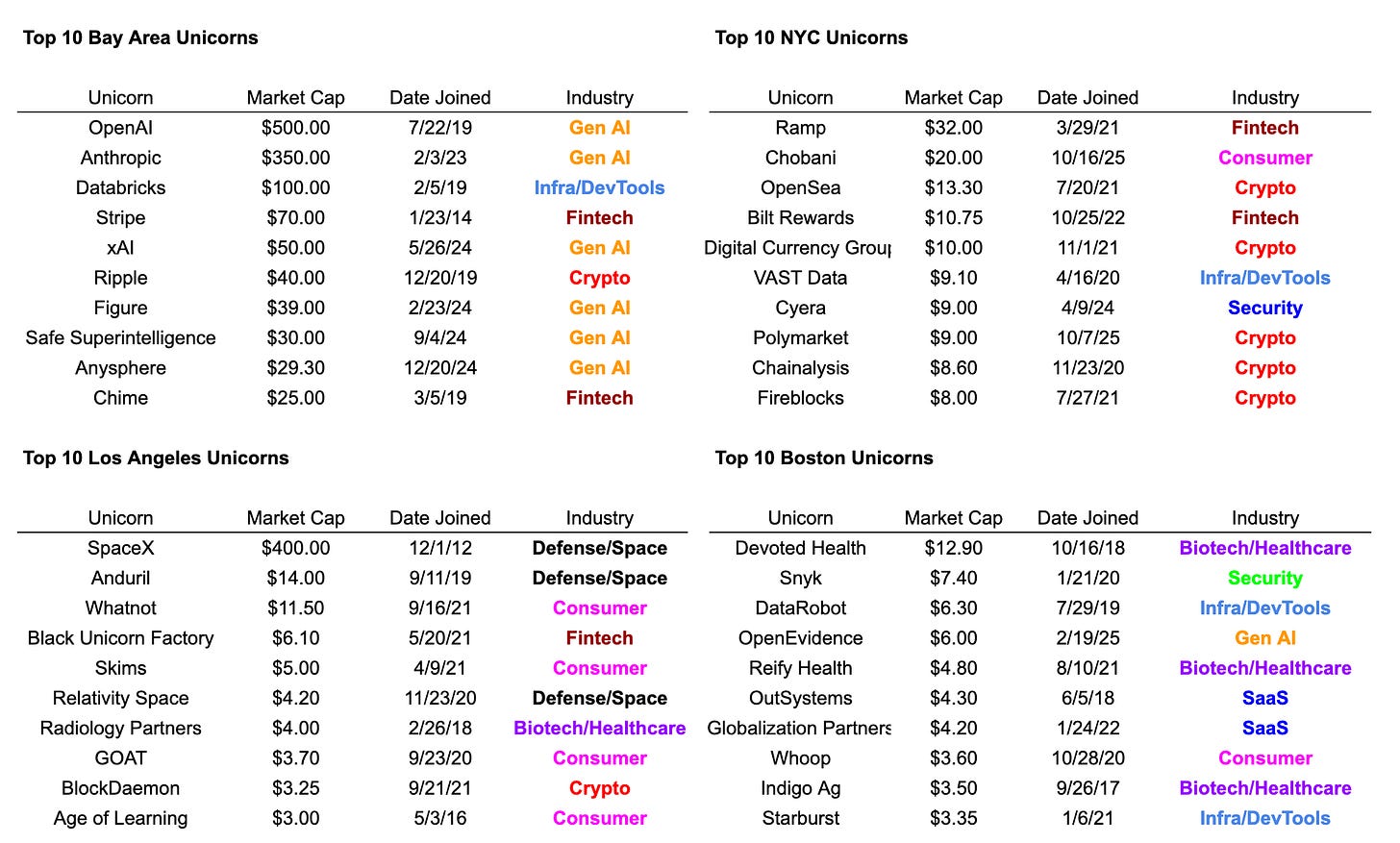 Unicorn hubs tend to consolidate around specific industries: 6 of the top 10 unicorns in the Bay Area are gen AI companies, while 7 of the top 10 unicorns in New York are fintech/crypto companies. 3 of the top 5 unicorns in LA – SpaceX, Anduril, and Relativity – are defense/space (accounting for 83% of LA’s total market cap), and another 4 of its top 10 are consumer.